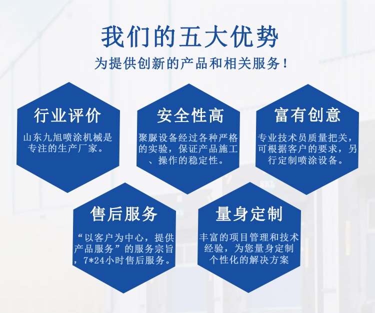山東九旭機械科技有限公司歷經(jīng)十幾年的發(fā)展,已成長為液壓聚脲設備行業(yè)頗具實力的設備制造業(yè)之一。主要產(chǎn)品:聚氨酯高壓噴涂機、聚氨酯高壓發(fā)泡機、液壓聚脲噴涂設備及設備配件(聚氨酯高壓噴槍、槍嘴、加熱管道、料塊、摩擦副、增壓泵、混合式、提料泵等)也是堅持最好的質(zhì)量服務用戶,